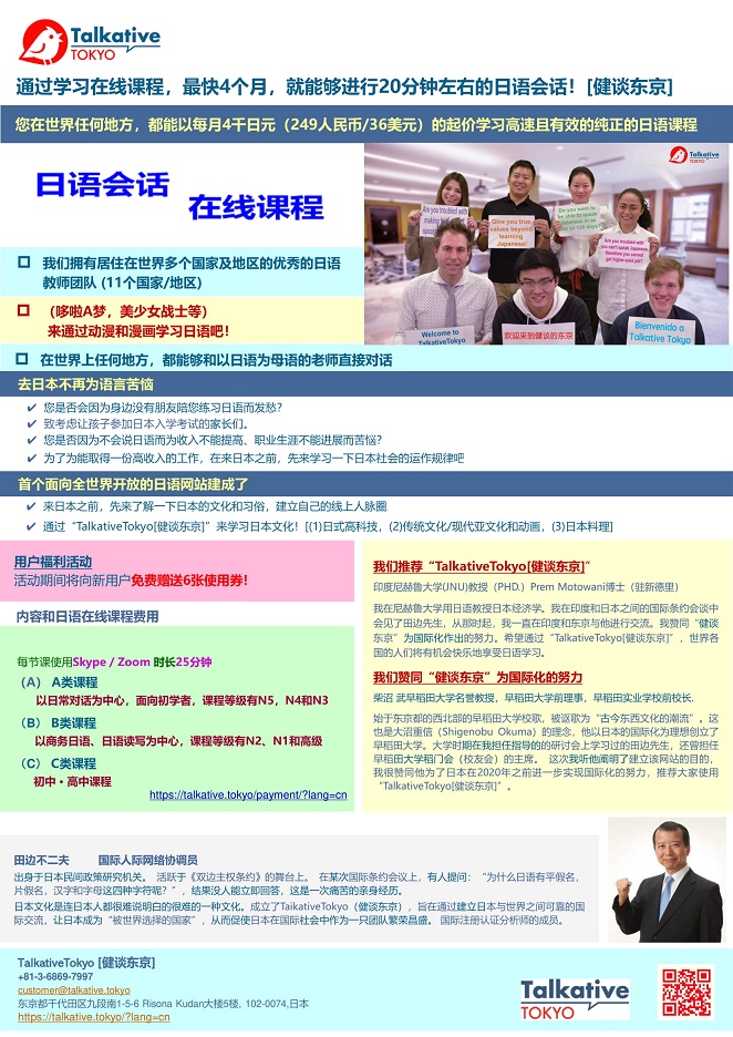 - 【プレスリリース/Press release/新闻稿】2021年4月1日プレスリリースを発出しました。TalkativeTokyo [おしゃべり東京/健谈东京]中国語サイトを新設 https://talkative.tokyo/lang?=cn 日本語を学びたい、中国語を母国語とする方へ