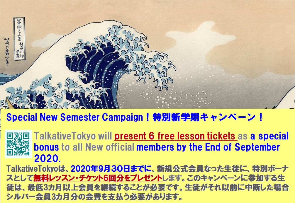 - 【特別新学期キャンペーンのお知らせ!】 TalkativeTokyoは、2020年9月30日までに、新規公式会員 になられた生徒全員に対して、特別ボーナスとして無料レッスン・チケット6回分をプレゼントします。このキャンペーンに参加する生徒は、最低3カ月継続して会員であることが必要です。生徒がそれ以前に中断した場合はシルバー会員6回分の会費を支払う必要があります。