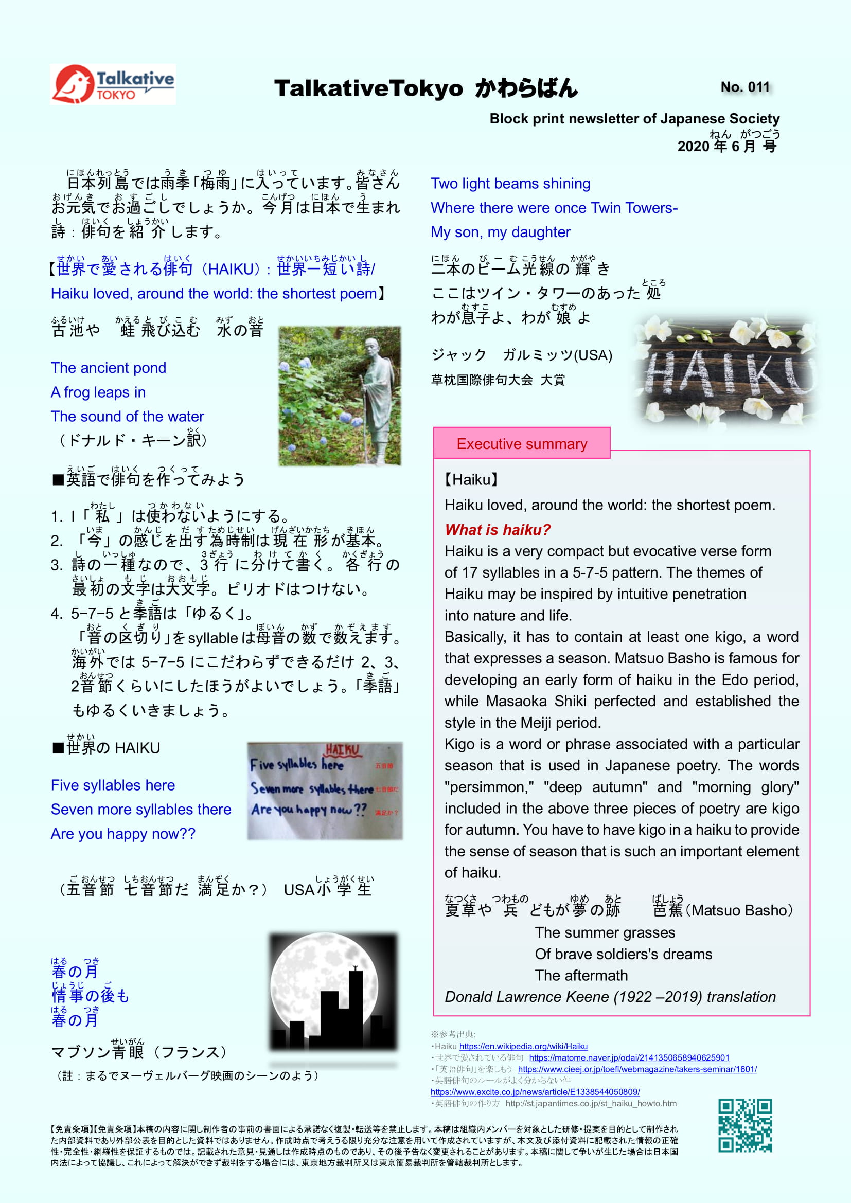 - かわらばん6月号(がつごう)を発行(はっこう)しました。 TalkativeTokyo Kawaraban ~Block print newsletter of Japanese Society ~ June 2020 has been published. 今月(こんげつ)のテーマは 【世界で愛される俳句(HAIKU):世界一短い詩】 This theme is 【Haiku】 Haiku loved, around the world: the shortest poem. . The TalkativeTokyo Kawaraban is a Newsletter and Text introduces Japanese culture and society to our students.
