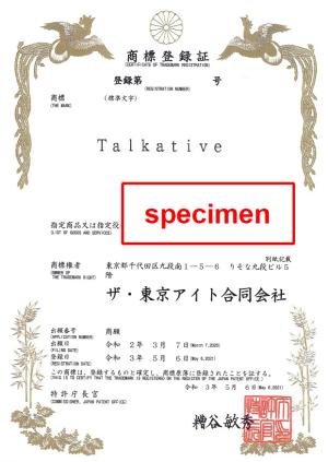 - 「Talkative」が商標登録として日本特許庁長官より公式承認されました。
